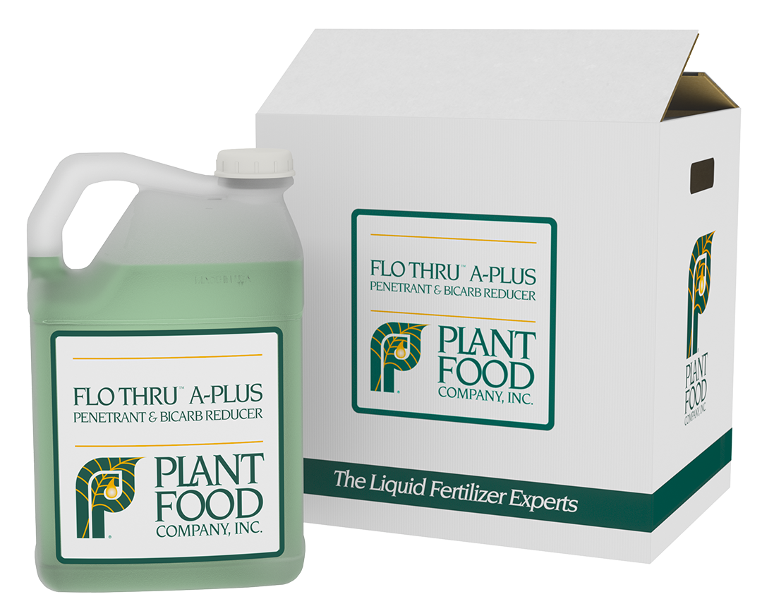 FloThru A-Plus is an acid-based penetrant that dissolves bicarbonates and frees calcium. Available soil calcium will then displace soil sodium. The penetrant “flattens” droplet beading by reducing water tension. This results in even coverage of sprays on leaf blade. The penetrant also provides even water penetration into the soil which reduces localized dry spots. The double action of FloThru A-Plus results in even spray coverage on leaf blade, faster and even water penetration into soil, and consistent soil moisture due to uniform water movement. Dissolving bicarbonates provide available soil calcium for an extended period due to the long-lasting acid.
